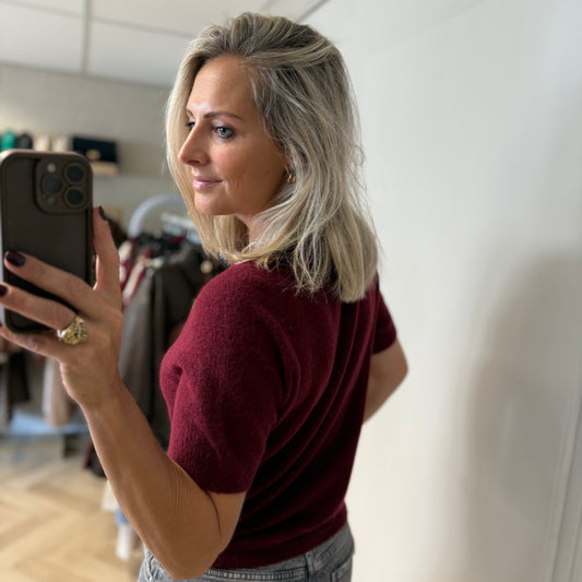 alpacawol. We zijn ooit begonnen met de lange mouwen ronde hals variant. Daarna