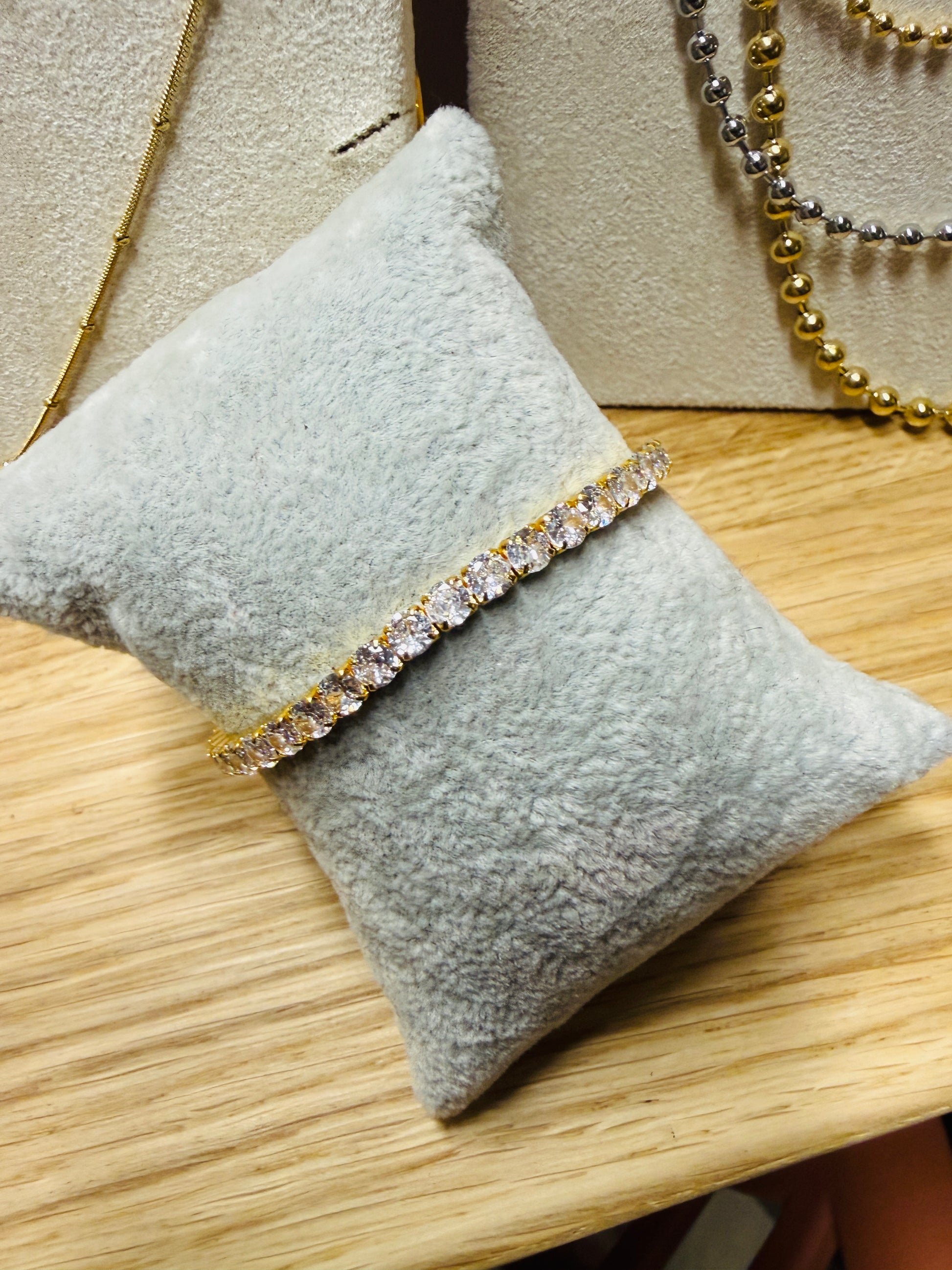 Elastisch tennis bracelet met vierkante steentjes. De armband is goudkleurig en de steentjes zijn neutraal.
