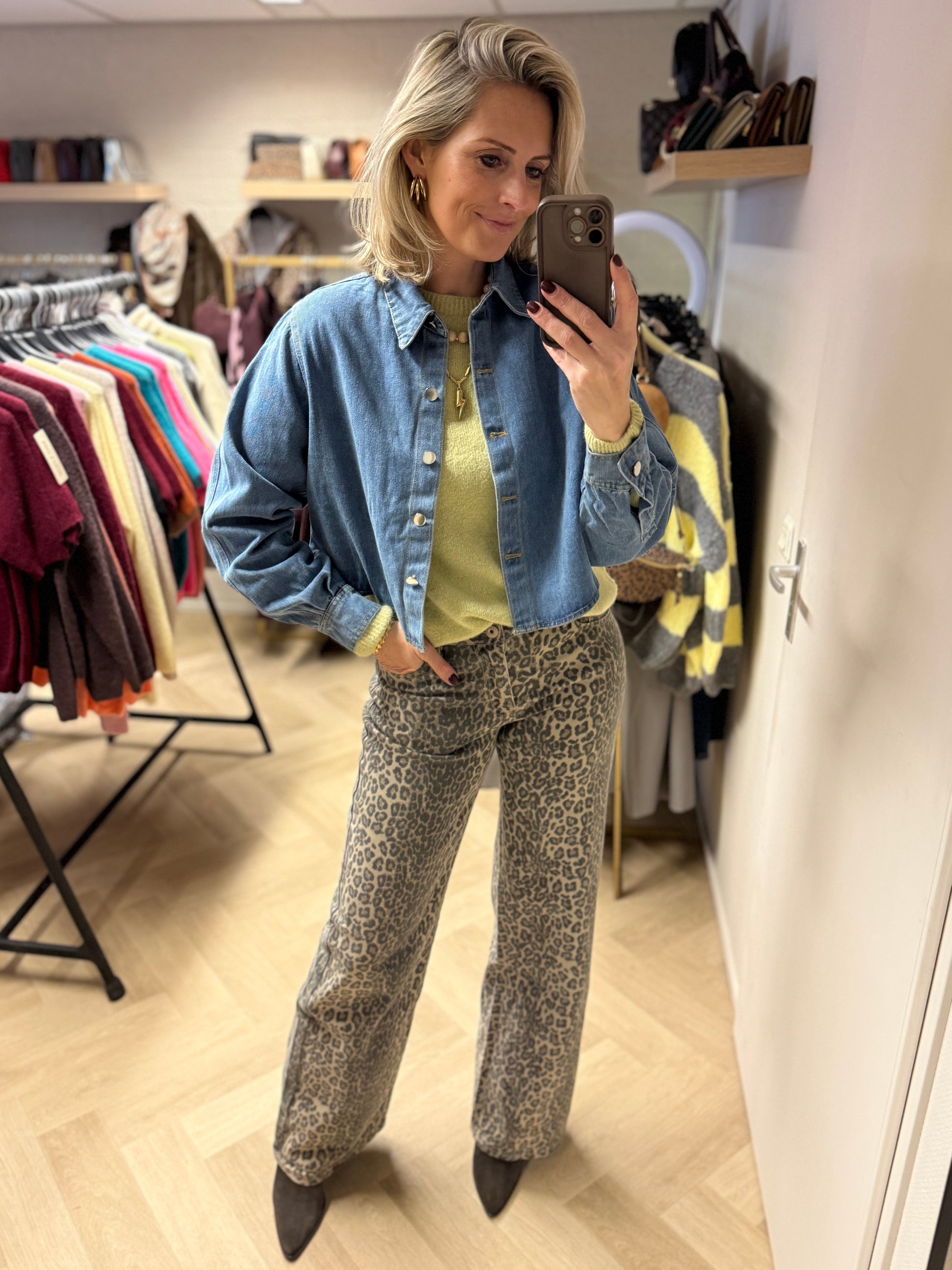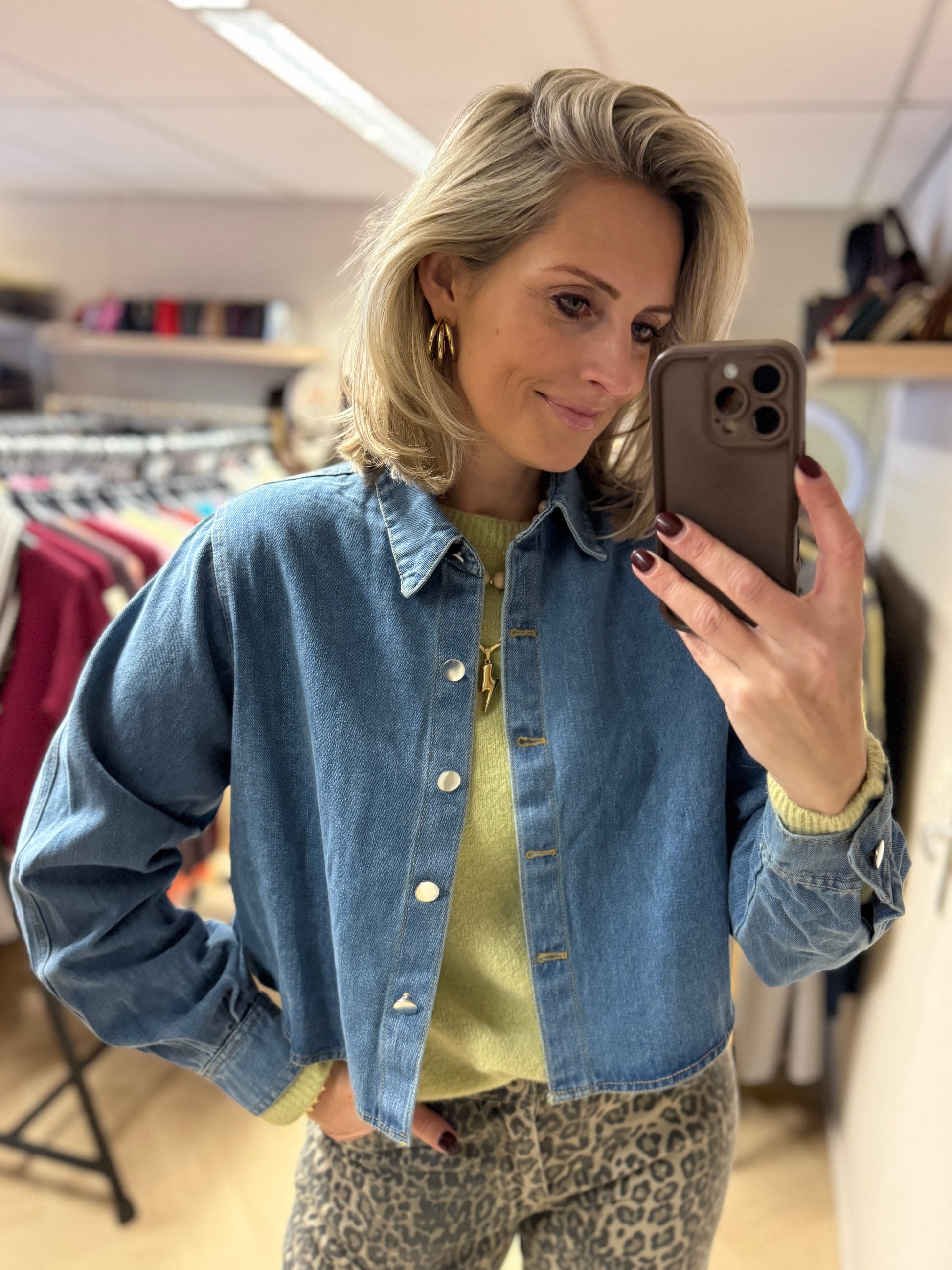 Denim blouse met lange mouwen. De blouse valt iets korter. Ik draag hier maat M en mijn confectiemaat is 38/M en ik ben 1,79.
