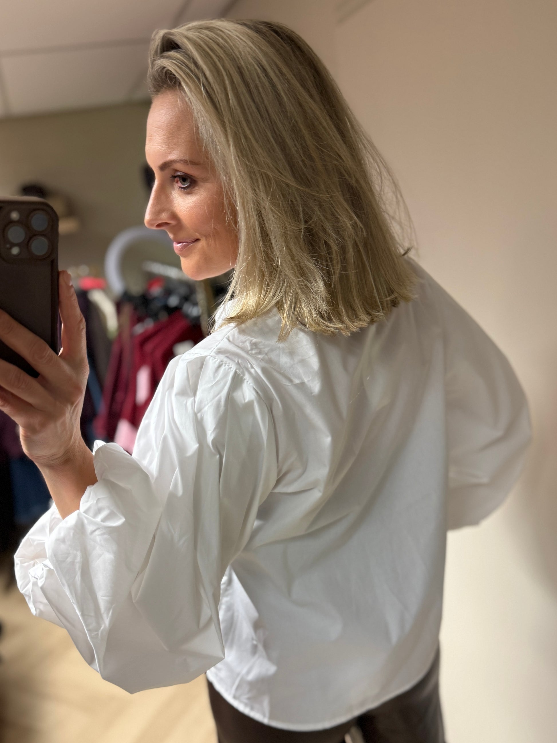 Super mooie katoenen blouse met een opstaande kraag en pofmouwen. De blouse valt recht op het lijf. De blouse is one size en kan gedragen worden tot en met maat 40. Mijn confectiemaat is 38/M en ik ben 1,79.