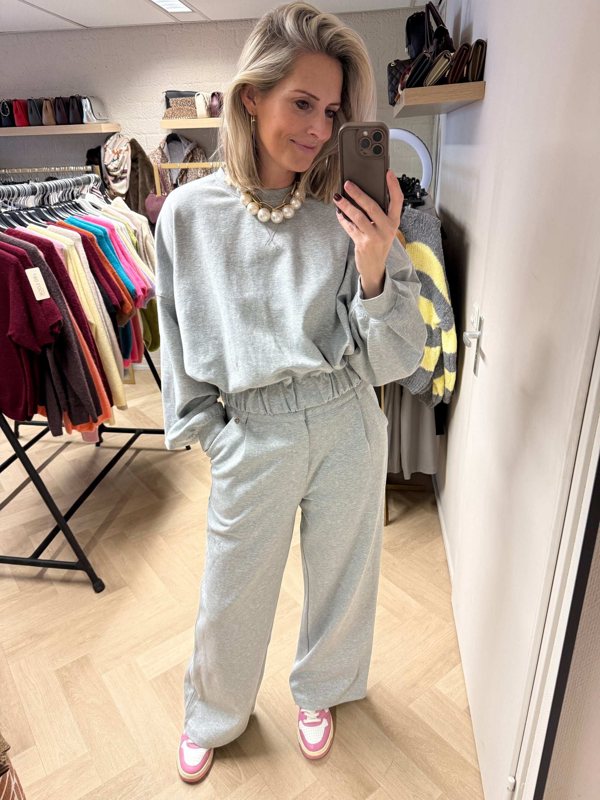 Deze lichtgrijze katoenen joggingstof pantalon heeft steekzakken en een bandplooi. De pantalon heeft een schuifsluiting en een één-knoopssluiting. De binnenbeenlengte van deze broek is 79 cm bij maat S (lengte 34). Deze pantalon valt normaal op maat, dus neem je eigen maat en zit je tussen twee maten in neem dan de kleinere maat. Ik draag hier maat M. Mijn confectiemaat is M/38 en ik ben 1,79.