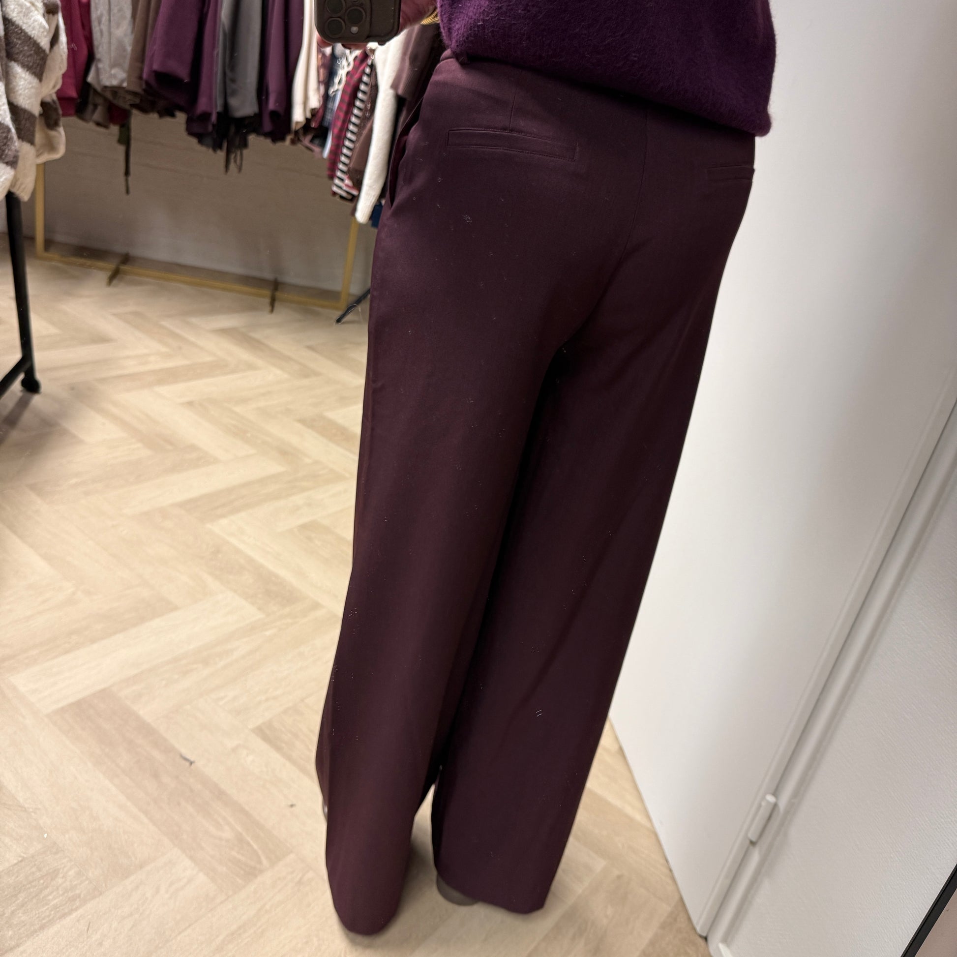 Deze pruimenpaarse pantalon heeft steekzakken en een bandplooi. De pantalon heeft een schuifsluiting en een één-knoopssluiting. De binnenbeenlengte van deze broek is 79 cm bij maat S (lengte 34). Deze pantalon valt normaal op maat, dus neem je eigen maat en zit je tussen twee maten in neem dan de kleinere maat. Ik draag hier maat M. Mijn confectiemaat is M/38 en ik ben 1,79.