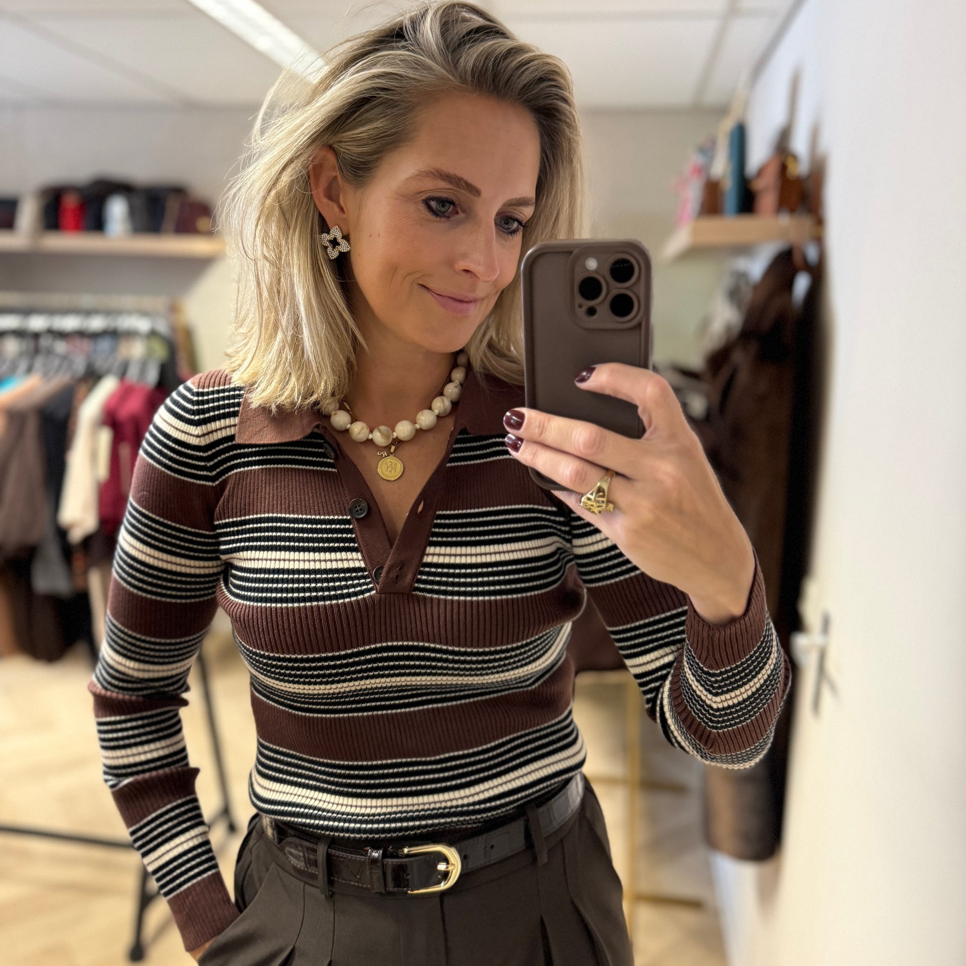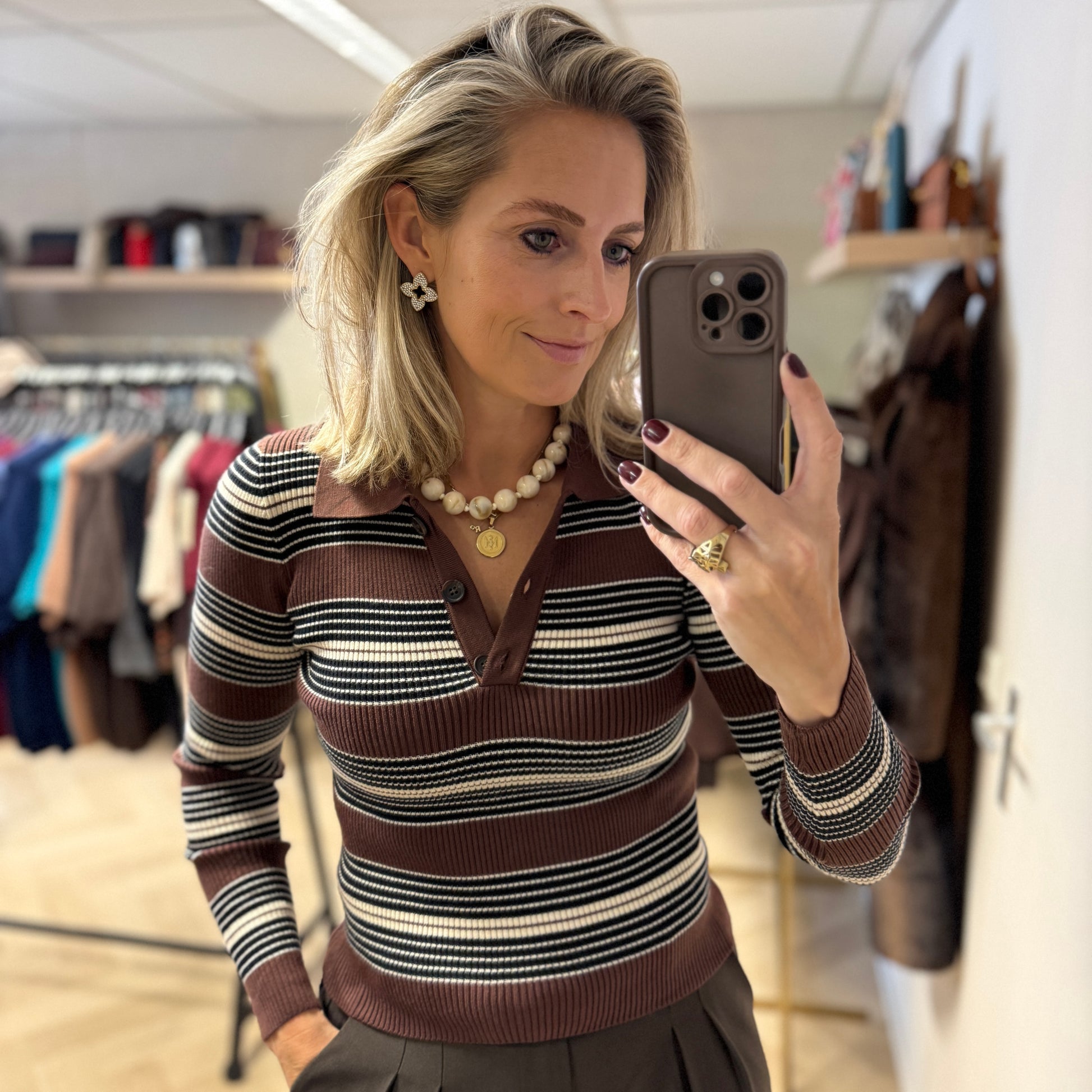 Een trui met een kraagje en knoopjes. Het is dus een polo model, maar wel een aansluitend model. Het fijne aan deze trui is dat er bruin met zwart gecombineerd is, dus erg leuk om te combineren. Zowel netjes op een pantalon als casual te dragen op een jeans. De polo valt niet lang, dus houdt er rekening mee dat deze perfect is op een wat hogere jeans en als jij een lang bovenlijf hebt dan kan het wel iets te kort zijn.