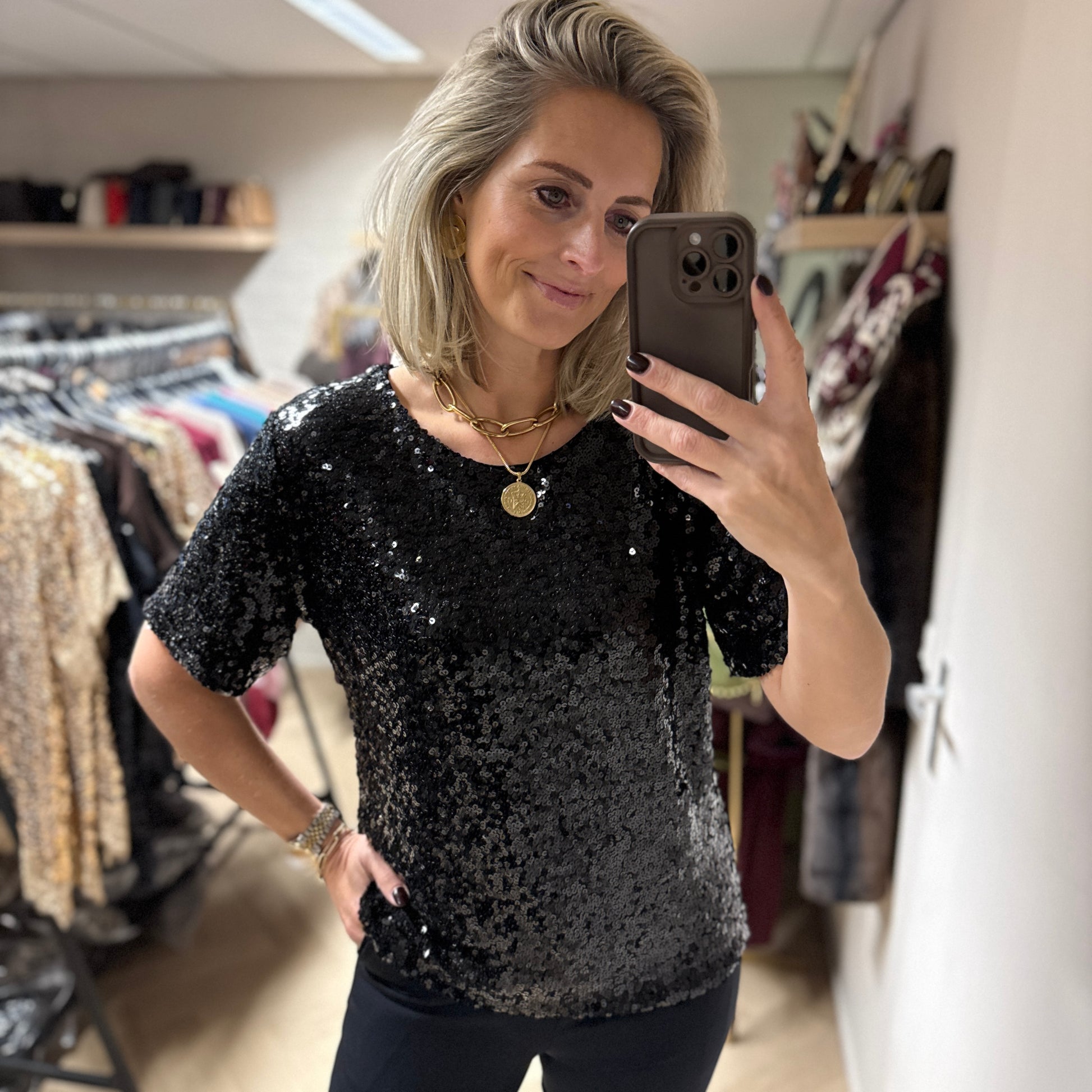 Een prachtige pailletten shirt met echt een rijke uitstraling. Het is een t-shirt model, valt ook iets losser op de buik en de maten vallen normaal. S/M is 36/38 en L/XL is 40/42. Ik vind dit dus ook tof op een jeans met hakken voor een feestje en combineer het pailletten shirt op een pantalon voor een nettere look. Het shirt heeft een voering, dus geen gekriebel van de pailletten tijdens het dragen.