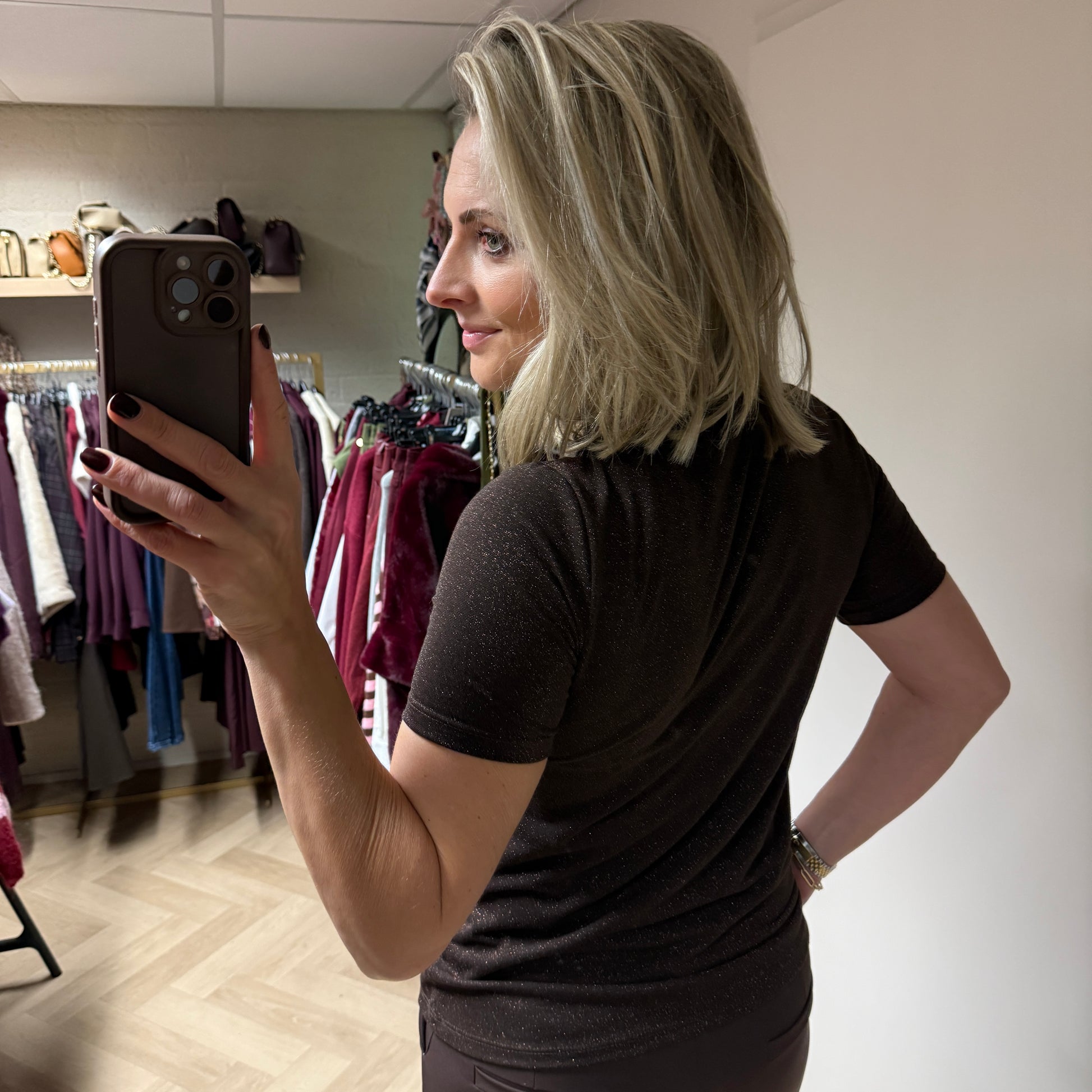 Heel simpel, maar prachtig bruin viscose shirt met korte mouwen en ronde hals. Het shirt is bruin met een glinster. Perfect voor een feestje, maar ik vind glimmers altijd leuk om te combineren. Het shirtje valt losjes, dus normaal op maat. S/M is 34/38/38 en L/XL is 40/42