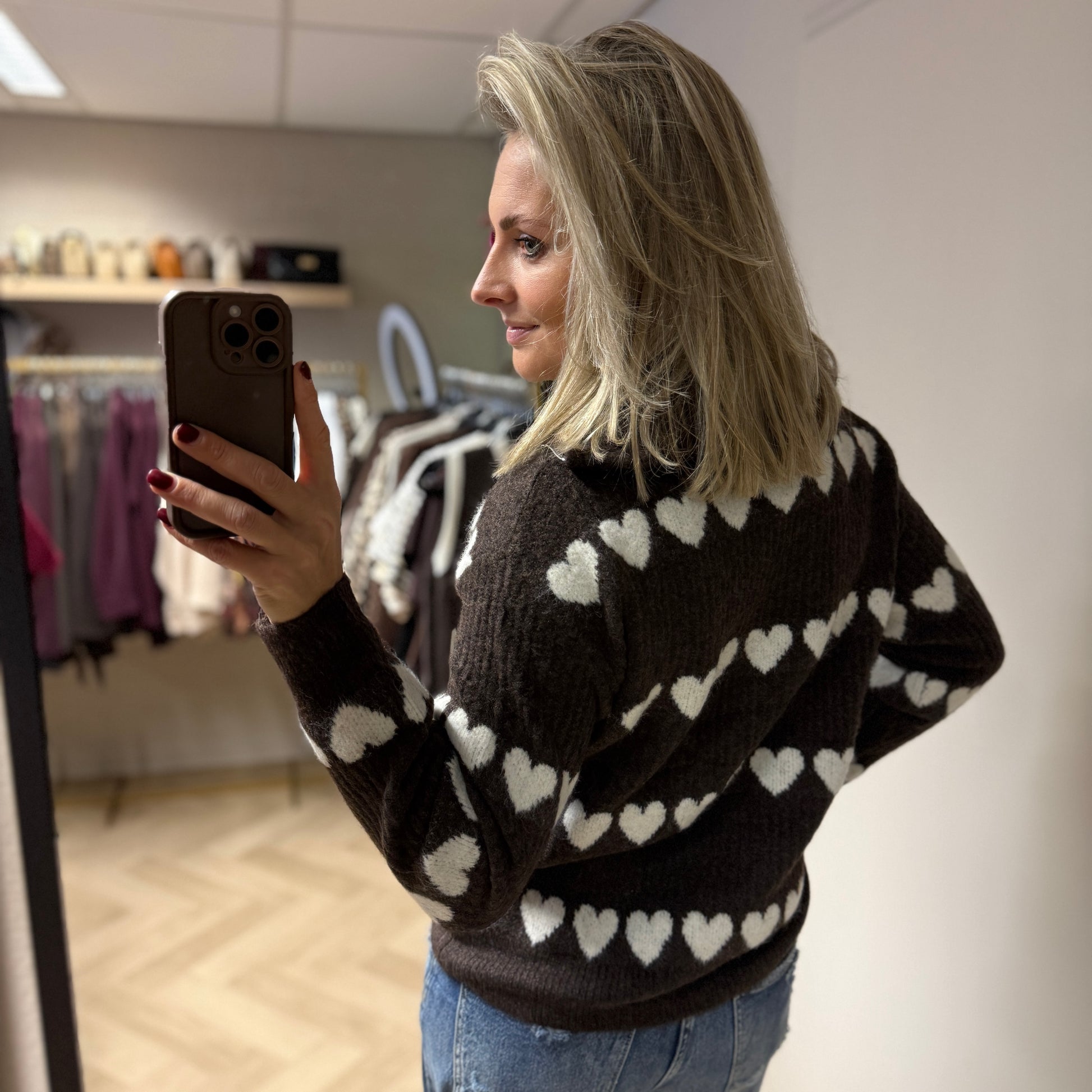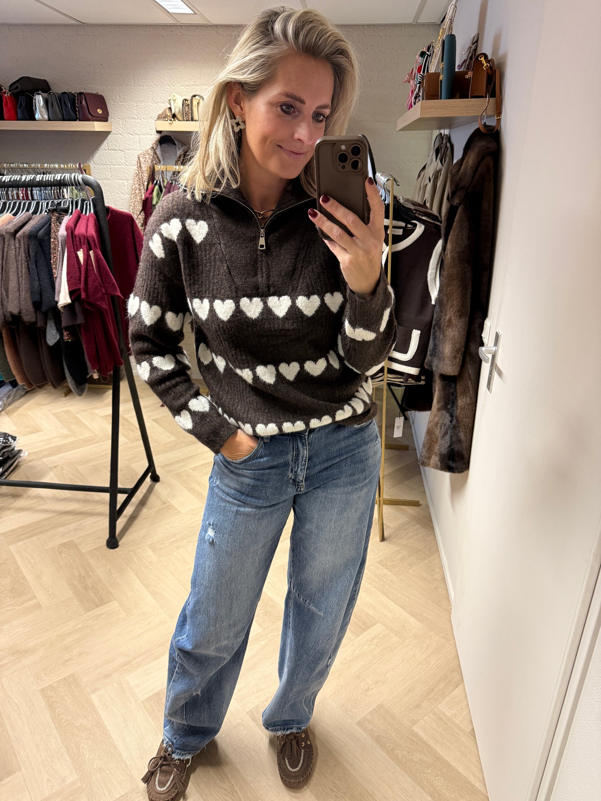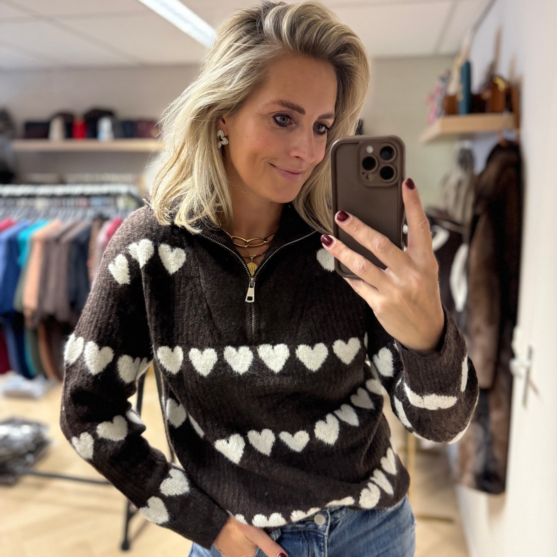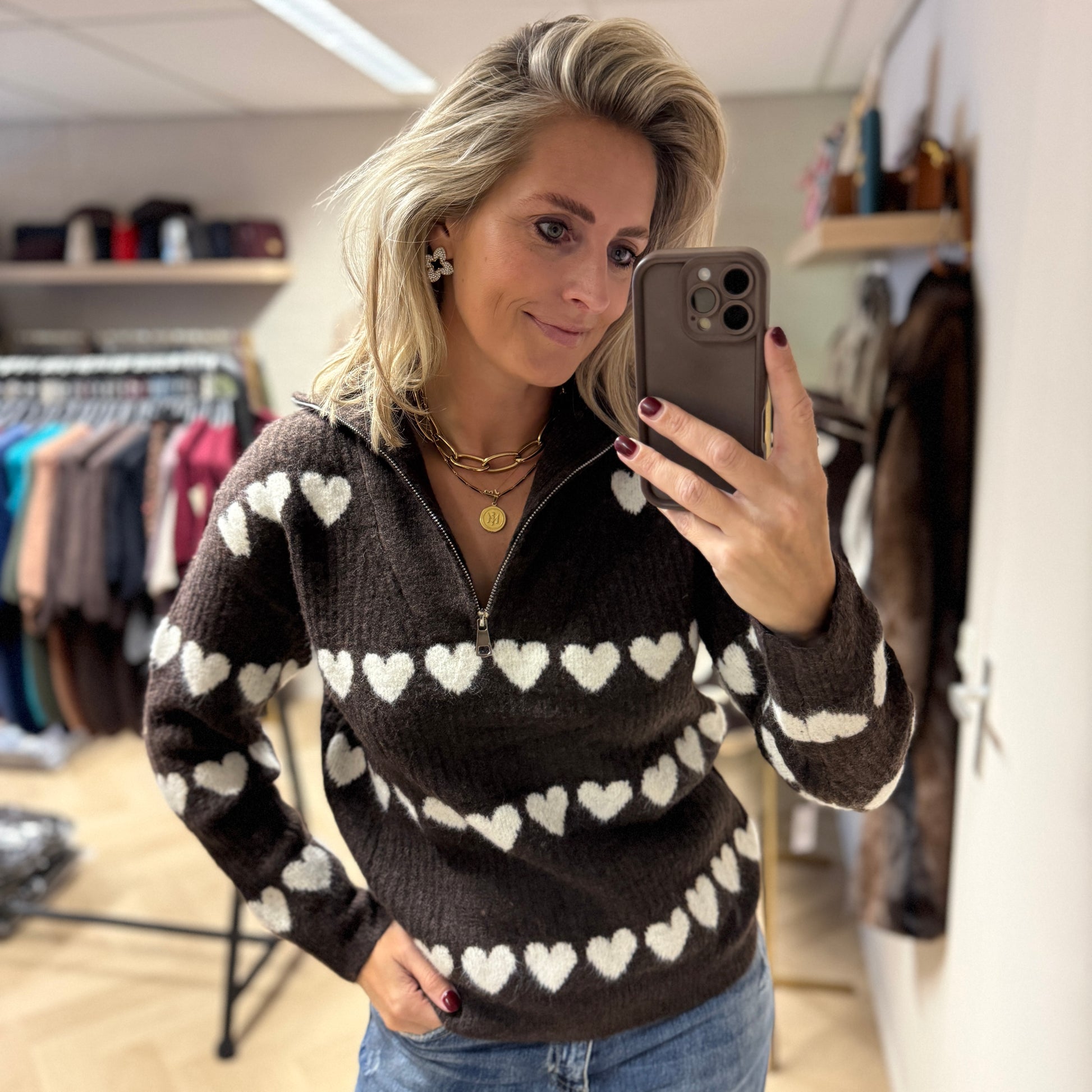 Voor de koudere dagen deze toffe donkerbruine trui met off-white hartjes. De trui heeft een rits die je of lekker open kunt dragen en een v-hals creeërt of dicht en een col effect hebt. Het is one size en kan echt wel gedragen worden tot en met maat 40.