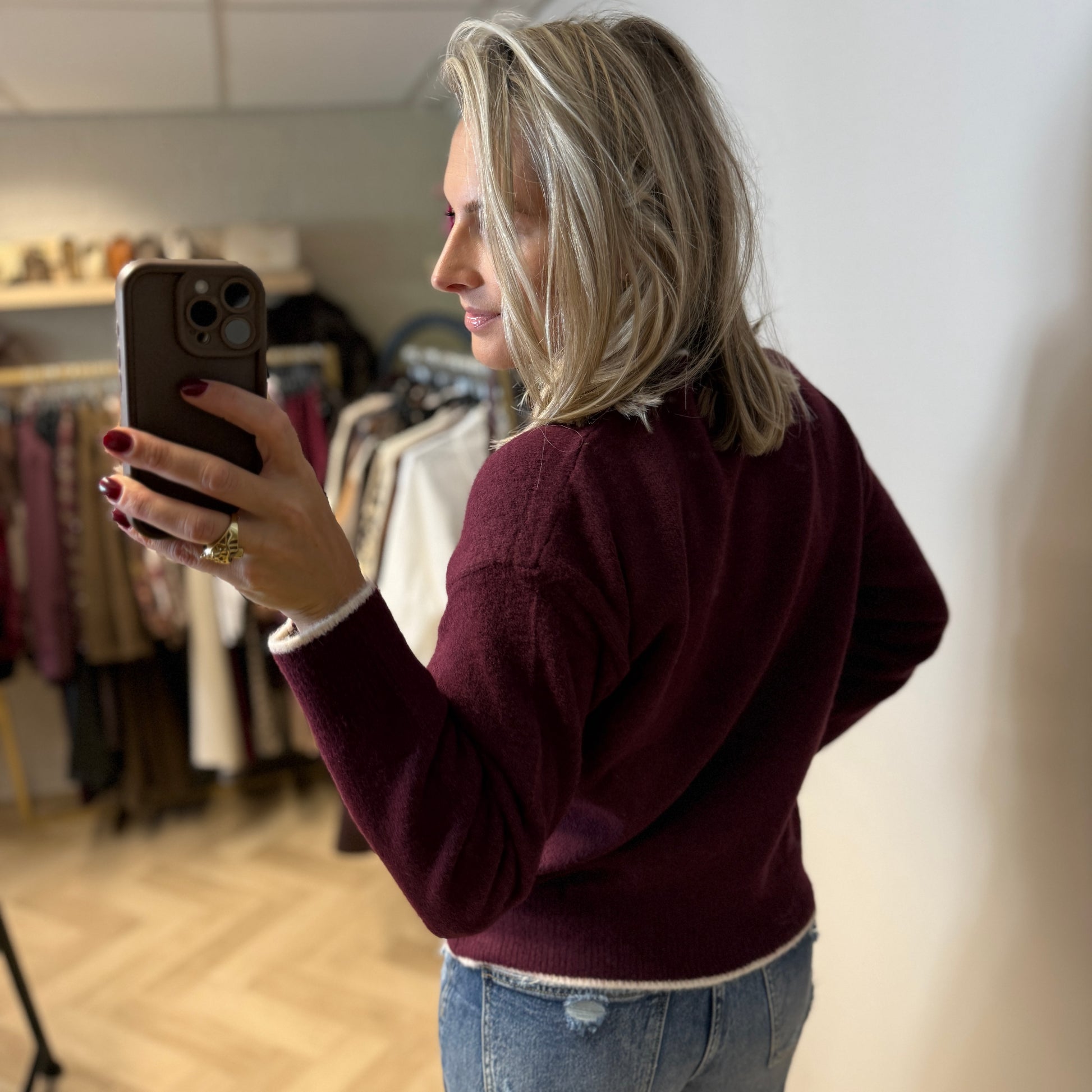 Een bordeauxrode trui afgewerkt met een offwhite biesje. En op de voorkant geschreven de tekst Oh La La! Altijd goed dit en zo lekker te combineren. De trui is one size en kan vanaf 34 t/m kleine 40.