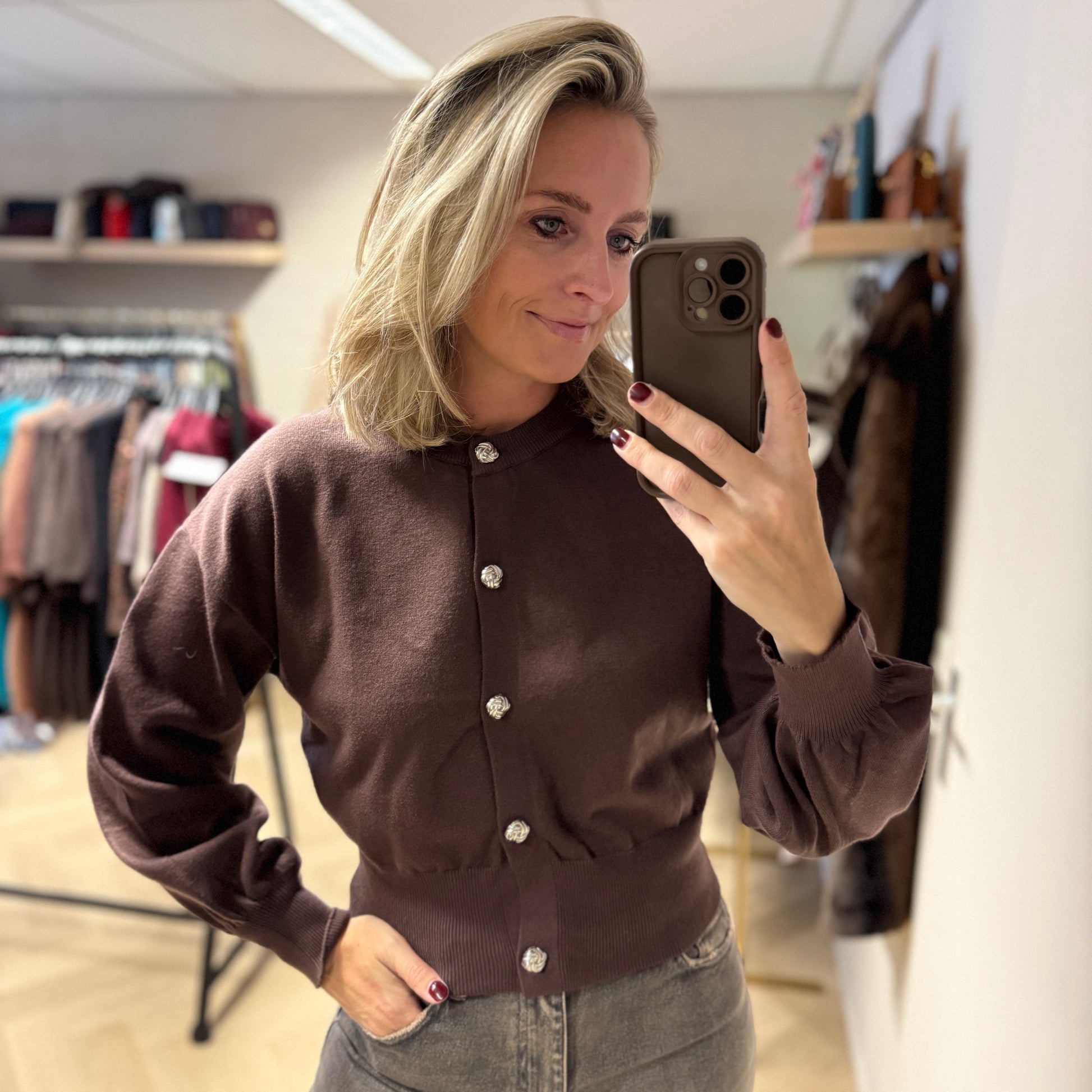 Heel mooi vestje met matte zilveren knopen. Het vest heeft pofmouwen en valt precies op de broek rand. Het is one size en kan gedragen worden tot maat 40.