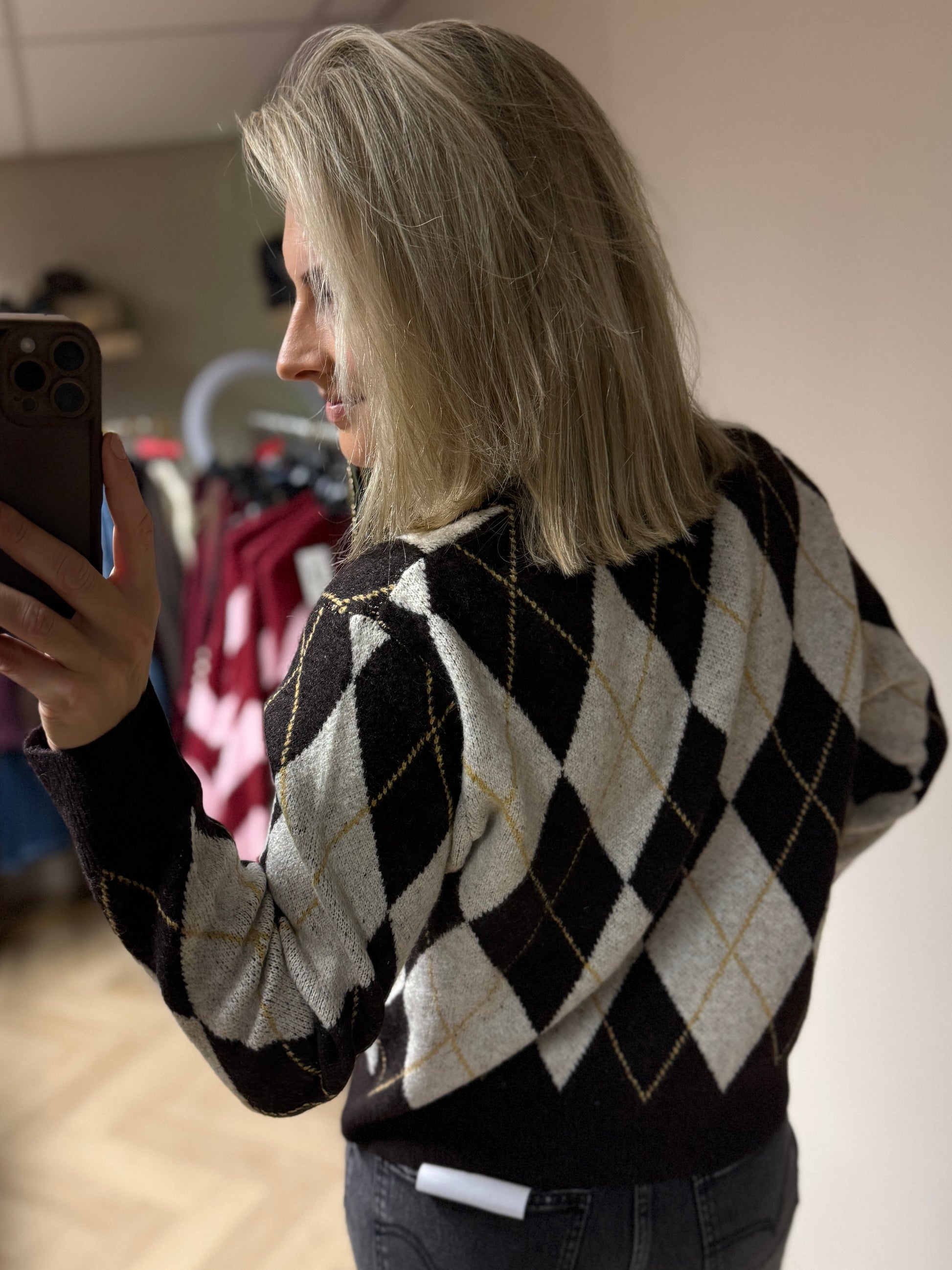 Heel sjiek vest met mee gestoffeerde knoopjes en een ronde hals. De print loopt helemaal door op de achterkant dus echt een mooie kwaliteit. Het vest heeft de trendy argyle ruit in de kleuren donkerbruin, beige en geel. Combineer dus met alle bruintinten of op jeans. Het is one size en kan echt wel gedragen worden tot en met maat 40.