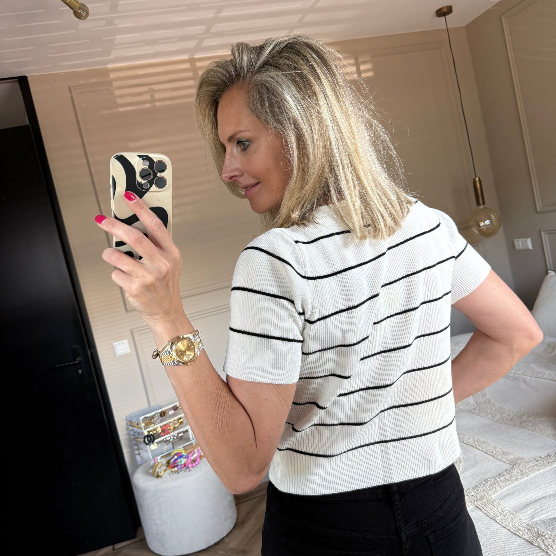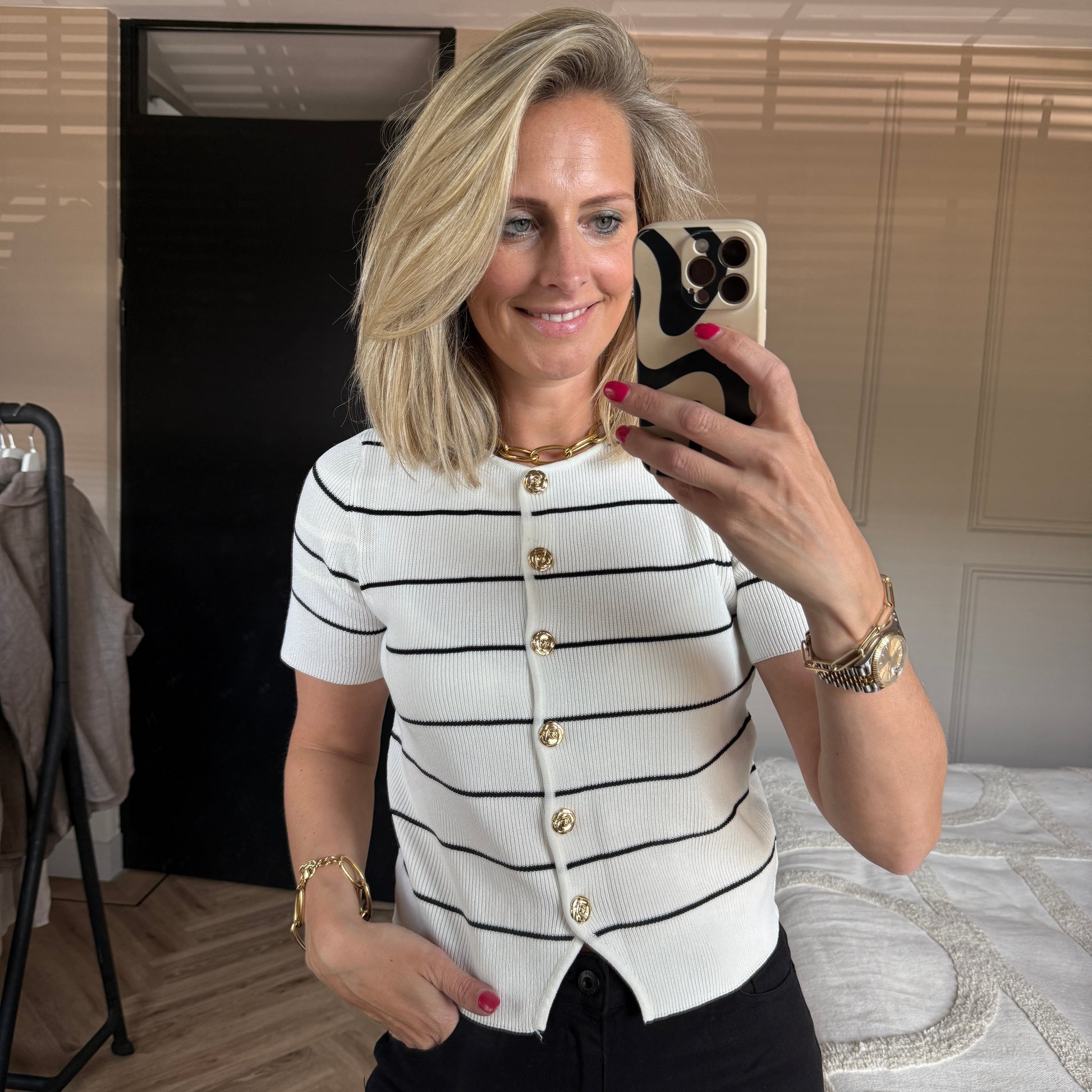 Heel schattig gestreept vestje wat je ook als topje kunt dragen. Het vest heeft drukknoopjes in de vorm van roosjes. Ik draag hier maat M/L en mijn confectiemaat is 38/M.